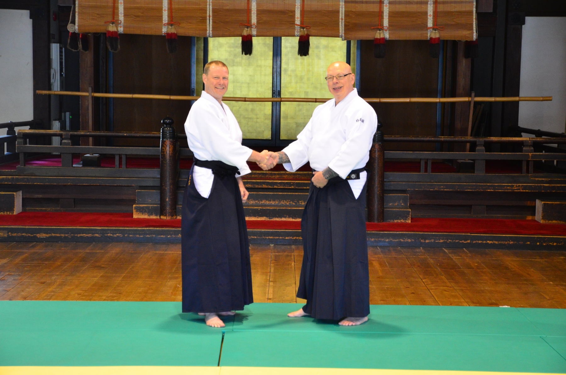 As with all good things, training was over far too quickly. After the formal end of the session Sensei Riley announced that Clive and Clive had distinguished themselves on the mat and he awarded them each their second kyu grades. Sensei Riley invited Shaun Fairweather to take examination in November for his sandan, and then awarded Simon Barrand his sandan on the mat.No session would be complete without photographs and there were many to take, both formal and informal. Eventually we had to leave, and groups made their way back to their hotels by taxi and by bus to get ready for the afternoon’s venture.