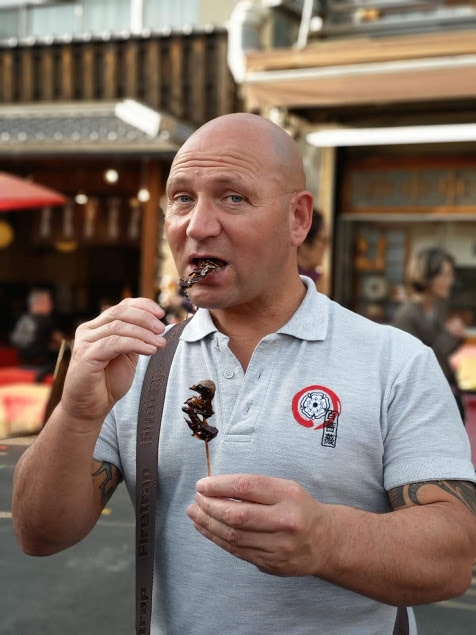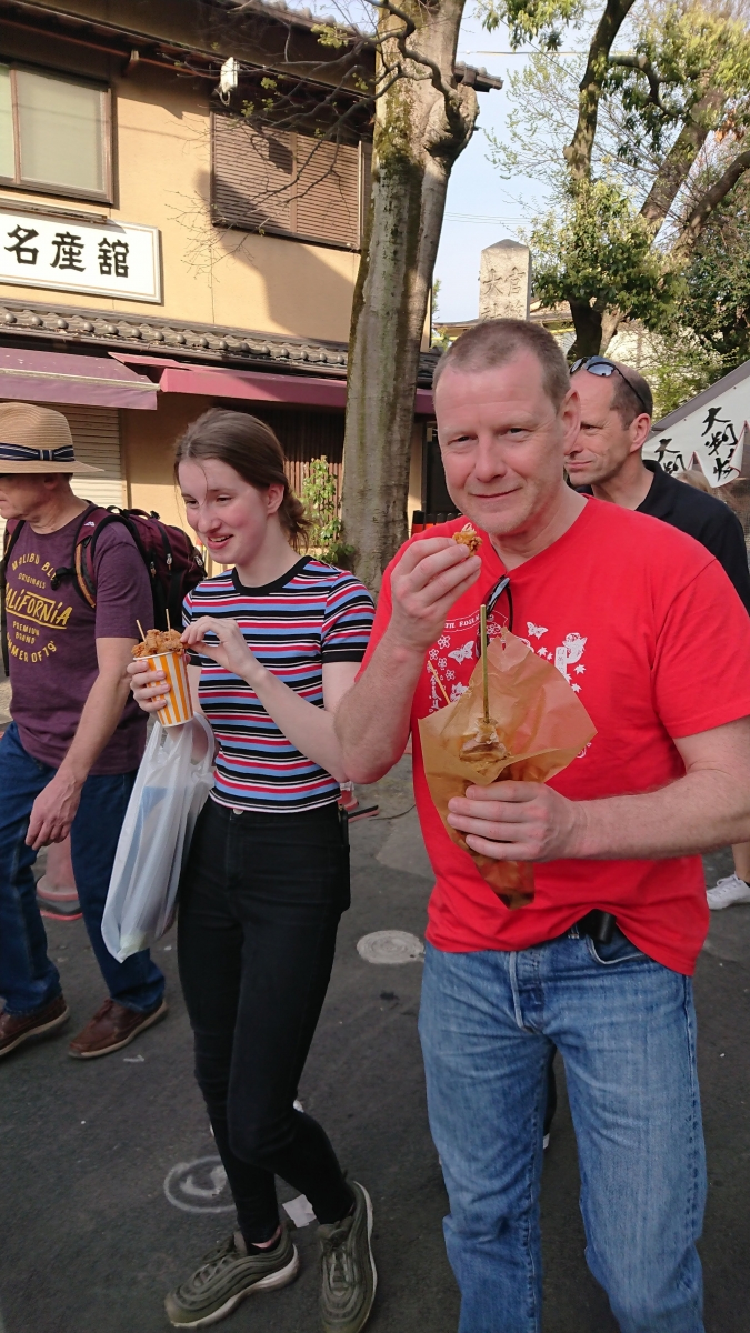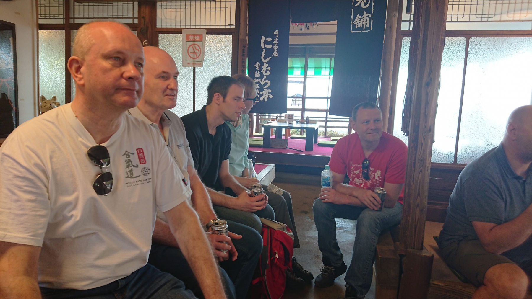 From there we headed back down the steps towards the streets at the bottom. Having had a beer, our thoughts turned to food and the street vendors lining the routes. Shaun found a shop selling sparrows on sticks, deep fried sparrows. Shaun and Sensei Derrick tried a couple, the rest of us managed to resist the temptation.After travelling back to our base in Shijo Omiya we headed out for a final drink of the evening, and of course headed back to “Sensei’s secret bar”. The owner asked if we would wait outside for a moment, and as we looked through the window we could see he was moving the band out of their seating area at the back of the bar, to make room for us.